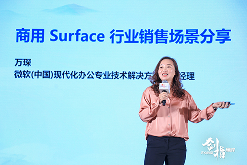 微軟(中國)現代化辦公專業技術解決方案部總經理萬琛女士給我們帶來了商用 Surface行業銷售場景分享,包括周大福、藍蛙等。